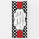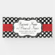 Diseño elegante y elegante de fondo polka blanco y negro, con cinta roja y forma de marco blanco. Agregue cualquier texto como Nombre comercial o etiqueta. Un bonito estilo retro de los años 50 estilo gráfico divertido de alto contraste que llama la atención. Todos los diseños Copyright © www.CustomInvitesOnline.com