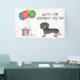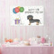 Diseño temático de cumpleaños lindo con el original ilustracion personalizado de Destei de un perro de raza Dachshund de color negro y abrigo color canto. Al lado del perro hay globos de cumpleaños coloridos atados sobre un hueso de perro y una caja de regalo de color morado y amarillo. El fondo está decorado en tonos pastel y con un fondo blanco. También hay un área de texto personalizable.