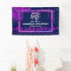 Banner de bienvenida morado y fiesta de playa con marco de neón, palmeras y lámparas de cuerda.