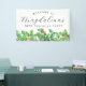 Elegantes estriberas de color verde de agua de invierno crean un hermoso borde de vegetación de vacaciones al final de esta pancarta de bienvenida de fiesta de cumpleaños, el verde holly es la flor de nacimiento de diciembre. Una combinación de fuentes de moda le da un aire moderno. Todo el texto es editable.
