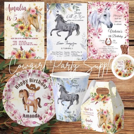 Caballos de rodeo y banner de fiesta de cumpleaños con temática de granja, con un caballo en carrera, rueda, zapatos de vaquero y gorra en un fondo fotográfico de burlap.