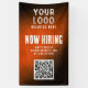 Now Hiring Banner with QR Code: Capture attention and streamline your hiring process with this eye-catching banner. Featuring the distinctive orange grunge gradient background, this banner prominently displays your company's logo alongside a QR code that links directly to your online job listings. Ideal for job fairs, corporate events, or placement outside your business premises, this banner effectively communicates your hiring needs while reinforcing your brand identity.