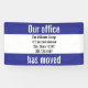 Esta pancarta azul y blanca al aire libre tiene tres campos. Juntos, los campos azules dicen ' nuestra oficina se ha mudado'. Utilice el campo blanco para personalizar de su postal con el nombre, la dirección y el número de teléfono de su empresa.
