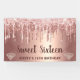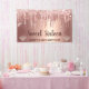 Haz que tu celebración de Sweet Sixteen brille con este impresionante banner de purpurina con goteo de rosa dorado. Con una glamurosa cascada de gotas de purpurina rosa dorado falsas, acentos de diamantes brillantes y elegante escritura fluida, este diseño ofrece la combinación perfecta de lujo y estilo moderno. El nombre personalizable y los detalles del cumpleaños lo convierten en un hermoso punto focal personalizado para la decoración de la fiesta.
