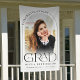 Este elegante cartel de la fiesta de graduación en blanco y negro es neutro en cuanto a género y cuenta con una foto, un arco y una elegante tipografía moderna.
