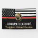 Este diseño cuenta con una bandera de bomberos con rayas blancas y negras y una delgada franja roja. "Felicitaciones" y el casco de un bombero se sienta por encima del nombre del bombero que se gradúa. Este diseño también funciona bien para los bomberos, lugartenientes o jefes que se retiran. ¡Celebren con estilo!