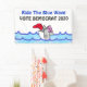 Humor político, Paseo por la Ola Azul, Vota Demócrata, tiburón comiendo gorra rojo de Maga mientras viste a un gorra rosado de gasa.
