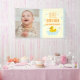 ¡Un pato afortunado! Primer cumpleaños con un pato de goma y burbujas contra un fondo azul claro de gingham y amarillo pálido con texto naranja. Plantilla de foto vía Pixabay bajo licencia CC0 y debe ser reemplazada por su propia foto