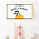 Este divertido banner de bienvenida para niños Fiesta de Halloween presenta una tonta y sonriente lata negra sentada encima de una calabaza de linternas de jack o'. el texto dice "Feliz Halloween" con una angustiada letra. La pancarta de bienvenida para el Partido de Halloween tiene una frontera naranja y negra.