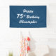 Una qué bandera única para una 75.a fiesta de cumpleaños. El fondo es un modelo azul de la tela escocesa. Usted puede personalizar tres líneas de texto blanco de su elegir - conveniente para cualquier edad. Seleccione el material interior o al aire libre. Todos los derechos reservados © Alan 2016 y Marcia Socolik
