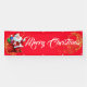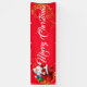 Esta pancarta de la Fiesta del Navidad se muestra en el estilo al aire libre con grommets. Seleccione entre interior o exterior, con o sin mangas. Mostrado en Rojo con "Feliz Navidad" blanco con Santa y sofisticado guión con dos remolinos de estrellas de aspecto dorado en cada extremo.