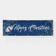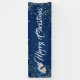 Esta pancarta de la Fiesta del Navidad se muestra en el estilo al aire libre con grommets. Seleccione entre interior o exterior, con o sin mangas. Mostrado en azul marino con "Feliz Navidad" blanco con campanas de plata y guión lujoso con dos estrellas de aspecto plateado en cada extremo. Personalizar o compra según el diseño.