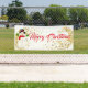 Esta pancarta de la Fiesta del Navidad se muestra en el estilo al aire libre con grommets. Seleccione entre interior o exterior, con o sin mangas. Mostrado en blanco con "Feliz Navidad" Rojo con Snowman y guión lujoso con dos estrellas de aspecto dorado en cada extremo. Personalizar o compra según el diseño.