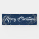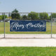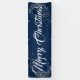Este banner de Holiday se muestra en el estilo exterior con grommets. Seleccione entre interior o exterior, con o sin mangas. Mostrado en Midnight Blue con un guión elegante de "Feliz Navidad" blanco con dos giros de estrellas de aspecto plateado en cada extremo. Personalizar o compra según el diseño.