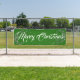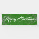 Este banner de Holiday se muestra en el estilo exterior con grommets. Seleccione entre interior o exterior, con o sin mangas. Mostrado en verde con el guión elegante "Feliz Navidad" blanco con dos giros de estrellas de aspecto plateado en cada extremo. Personalizar o compra según el diseño.