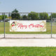 Esta pancarta de la Fiesta del Navidad se muestra en el estilo al aire libre con grommets. Seleccione entre interior o exterior, con o sin mangas. Mostrado en blanco con "Feliz Navidad" Rojo con Snowman y guión lujoso con dos estrellas de aspecto dorado en cada extremo. Personalizar o compra según el diseño.