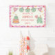 Adorable pancarta divertida de cumpleaños con una linda rana verde kawaii con una vela en la cabeza, que saca lo mejor de una torta de cumpleaños. La tarta tiene esponja amarilla, mermelada roja y glaseado rosado con salpicaduras, sentada en un plato morado. La rana es verde y tiene una dulce sonrisa en su cara. Otra feliz rana verde sosteniendo un globo en forma de corazón rosado con un gorra fiesta y una cadena de banderas por encima de la pancarta con banderas y caras de rana feliz. El texto que dice "Bienvenido al cuarto Fiesta de Cumpleaños de Sophia" está en el centro del cartel, es una plantilla que puedes cambiar fácilmente usando la herramienta que se proporciona para personalizado tu banner para el mensaje perfecto del fiesta. El fondo es una guinda en el blanco sobre un borde rosa con puntos de color para decorar.