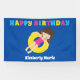 Impresionantes niños fiesta de piscina Feliz Cumpleaños para un niño morena en el equipo de natación durante el verano. Cuenta con un brillante y divertido pop de colores y un adorable chica de natación en un tubo interior. Personalizar esta decoración especial de fiesta infantil.