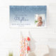 Bienvenidos a esta moda, glamurosa pancarta con fotos de la fiesta de cumpleaños número 80, con un purpurina de imitación azul brillante y un fondo azul oscuro. Reemplace fácilmente la imagen de muestra con una foto del invitado de honor. Personalízalo con su nombre en escritura a mano azul, con el cumpleaños y la fecha debajo en fuente sans serif azul.