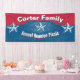 Banner moderno de estilo vintage rojo, blanco y azul. Cuenta con tres estrellas blancas que acentúan el cartel de su evento personalizado. Añade tu apellido, nombre de la escuela, nombre de la compañía, grupo militar para crear tu propio cartel de reunión. Ideal para picnics familiares, picnics de la empresa, recaudadores de fondos, eventos patrióticos el 4 de julio, ventas, escuelas, publicidad, graduación, bodas, aniversarios, cumpleaños, recién nacido, felicitaciones y más. Características de fondo gastado y angustiado.