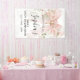 Blush pink watercolor coquette bow is decorated with roses and sage green greenery. A gold cross is placed above the text.