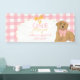Customize it with your child’s name to create a warm and coordinated look for your puppy themed birthday, pink gingham party, or golden retriever birthday décor. This banner looks beautiful displayed behind the dessert table, in photos, or as a cheerful welcome sign for guests.
