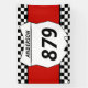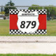 Portón trasero con estilo en su próxima carrera de motocross con banner personalizado. Este banner tiene un número de placa blanco que está listo para ser personalizado con su nombre y número de bicicleta. La placa numérica se coloca sobre un fondo rojo con un borde de bandera a cuadros en blanco y negro.