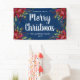 Esta pancarta de Merry Christmas fiesta incluye flores de poinsettia de color agua y follaje sobre un fondo azul marino. Personalizarla con un nombre y un año.