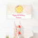 Esta bonita pancarta de cumpleaños ofrece un sol dulce con un fondo de acuarela rosa y letras falsas de Relieve metalizado dorado y puntos de confeti.