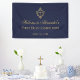 Un diseño marino y dorado con aire vintage, para la primera comunión de un niño. El fondo es azul marino. Hay un falso escudo de Relieve metalizado de oro con una cruz encima del texto. El mensaje "Bienvenidos a [Name]'s" está escrito en un guión caligráfico elegante, el resto en mayúsculas. Todo el texto es oro.