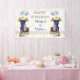 Bebés vintage sentados en tronos de terciopelo con pancartas que tienen texto personalizable con un ramo de globos atados a la silla y el oro presente. Uso para niños gemelos cumpleaños o ducha de bebé.
