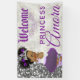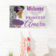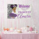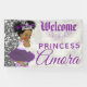 Princesa Afroamericana con adorables cócteles afro con tatuajes morados oscuros con un adorno de rosa blanca; canto de diamantes y tiara de diamante sobre un fondo purpurina floral de clavel blanco y plateado. Ideal para una ducha de bebé con temática de princesa púrpura o para una fiesta de cumpleaños. ©2023 Señales de Miss Fiesta Sassy