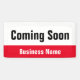 Este cartel exterior es rojo brillante, negro y blanco. Puede editar el texto para satisfacer sus necesidades. Puede agregar el mensaje de su personalizado (se muestra: Próximamente Nombre comercial). La parte superior es blanca con texto negro. La parte inferior es de color rojo intenso con texto blanco para el número de teléfono o el texto personalizado. Todo el texto se puede editar o eliminar.