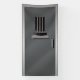 Cuenta con una falsa puerta metalizado de celda de prisión con un recluso asustado mirando a través del agujero de paso.