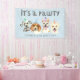 Banner de fiesta lindo para la fiesta de cumpleaños del tema del cachorro de su hijo. Ilustracion de 4 perros (dálmata, beagle, pit bull terrier) con gorras fiestas. El texto de arriba dice "es un trapo" y puedes agregar el nombre de tu hijo debajo del ilustracion.