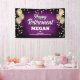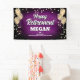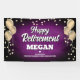 Fun banner sign for indoors or out, featuring festive gold metallic balloons on both sides of the design with sparkly, gold metallic confetti on a rich, royal purple textured background for your personalized retirement party banner.