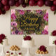 Elegante y romántico color rosa, burdeos y color de agua morado vintage floral y follaje sobre el personalizado negro "Feliz cumpleaños" fiesta banner con purpurina de oro. Personalizado con el nombre del invitado de honor. Comuníquese conmigo para obtener ayuda con sus personalizaciones o para solicitar productos adicionales de correspondencias o coordinación de Zazzle para su fiesta.