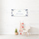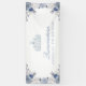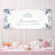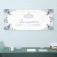 Banner fiesta de Quinceanera floral blanco y azul. Diseñado con delicadas flores azules y blancas acentuadas con un diamante brillante y una corona de gema azul claro. Esta bonita bandera es un complemento perfecto para tu decoración de quinceañera.