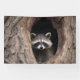 Joven y simpático mapache mirando desde el interior de un árbol grande.