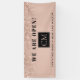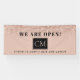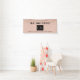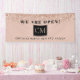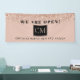 En un fondo dorado rosa claro bordeado por un purpurina rosa brillante, están las palabras que sus clientes han estado anhelando ver: "¡Estamos abiertos!" La pieza central de este banner horizontal es su logo monograma único de dos iniciales y su nombre comercial para un fácil reconocimiento de su negocio. Diseñado para negocios de peluquería y maquillaje, este banner podría ser adaptado para cualquier tienda minorista. Todo el texto se puede revisar fácilmente en la plantilla Personalización.