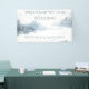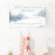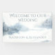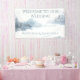 Banner de recepción de la boda azul y blanca diseñado con una escena de invierno de nieve suave caída con acentos de bosque azul. El texto incluye: Bienvenido a nuestro Boda, y los primeros nombres de The Bride & Groom. Para personalizar, simplemente inserte sus nombres en nuestra plantilla sencilla, reemplazando el ejemplo. No olvide ver la colección de Bodas de nieve azul y blanca de invierno. ¡Disfrútalo!