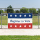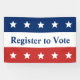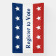 Puedes alentar el registro de votantes en tu comunidad. La parte superior es un campo azul que tiene cinco estrellas blancas. La franja intermedia es blanca y dice 'Regístrate para votar' en texto azul oscuro. La franja inferior es roja con cinco estrellas blancas.