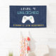 Bienvenido a los invitados a la fiesta de cumpleaños temática de su niño con este elegante banner retro que incluye un controlador de videojuegos en un fondo azul marino con letras de estilo digital vintage. "Nivel [edad] desbloqueado" aparece en la parte superior, con el nombre y la ocasión fiesta de su hijo debajo.