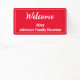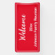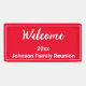 Este cartel de reunión familiar rojo brillante tiene un texto en blanco. Puede editar el texto para mostrar un mensaje personalizado. La línea superior del texto es un guión que actualmente dice Bienvenida. La línea central es para el año o la fecha. La última línea es para el nombre del evento.