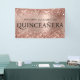 Una moderna y elegante caligrafía con un moderno estilo de letra todo tipo de mayúsculas en negro. Crea tu propio hito de celebración Quinceanera fiesta signo de bienvenida para tu hija. El fondo presenta un falso rosa brillante purpurina de oro con un color rojo metálico y un gráfico de arte digital de color rojo oscuro metalizado y rojo rosa de oro cepillado.