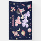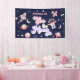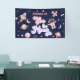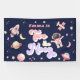 Este banner de cumpleaños espacial presenta textos retro de los años 70, colores rosa y morado y ilustraciones espaciales. Los ilustraciones son planetas, estrellas y un barco con cohetes. El fondo es el azul marino del espacio, lo que hace que este sea el cartel perfecto para celebrar a tu pequeño astronauta.