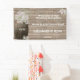 Viejo barril de vino con sus iniciales, flores rosadas y Respiración del bebé sobre fondo de madera de granero. Personalice con sus nombres y fecha para crear el banner perfecto para su Boda de Country Rustic.