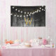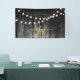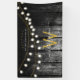 Un rústico granero de fondo negro de madera con luces colgantes de cuerda dorada con monograma dorado a juego. Un ambiente rústico de madera quemada con un toque de glam dorado. Personalizar el monograma y el texto y hágalo propio.
