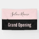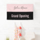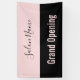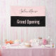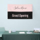 Una pancarta permite a todos saber que el salón de belleza está abierto para los negocios. El texto rosa pálido en la parte inferior dice 'Gran apertura'. El texto rosado está en una franja negra. Una franja rosa en la parte superior tiene un elegante guión negro para el nombre del salón de belleza.