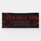 Tema de terror o tema de vampiros Salpicadura de sangre Banner de bienvenida personalizado "Regresa ahora" para una fiesta de Halloween espeluznante o casa embrujada con redacción personalizada con el nombre de la fiesta anual de su familia. Elija el tamaño adecuado para colgar en la puerta principal, junto a su exhibición de dulces o mesa de truco o trato, o utilícelo como telón de fondo para selfies, y agréguelo a su colección de decoraciones de Halloween duraderas y guárdelo para reutilizar en años futuros.